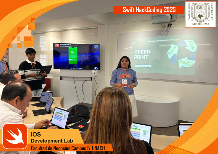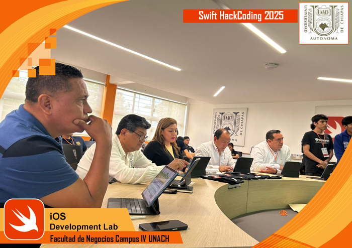 El pasado 21 de junio de 2025, el Laboratorio de Desarrollo iOS en colaboración con los integrantes de la Academia de Ingeniería de Software y tratamiento de información de la Facultad de Negocios Campus de la Benemérita Universidad Autónoma de Chiapas, organizaron una dinámica de exposición de proyectos denominada Swift HackCoding 2025, la cual tiene como objetivo que las personas estudiantes asistentes al curso-taller realicen la presentación de los prototipos o soluciones de aplicaciones iOS, aplicando los conocimientos adquiridos durante el desarrollo del curso; fortaleciendo con ello, al desarrollo de nuevas habilidades blancas como son: trabajo colaborativo, pensamiento crítico, comunicación, creatividad y resolución de problemas. En esta actividad profesores de la Academia de Ingeniería de Software, participaron como jueces evaluadores de los proyectos, siendo ellos: Mtro. Rene Servando Rivera, Dra. Vanessa Benavides García, Mtro. Luis Antonio Álvarez Oval, Dr. Aron de la Cruz Vázquez y Dr. Christian Mauricio Castillo Estrada, iOS Development Lab Manager.