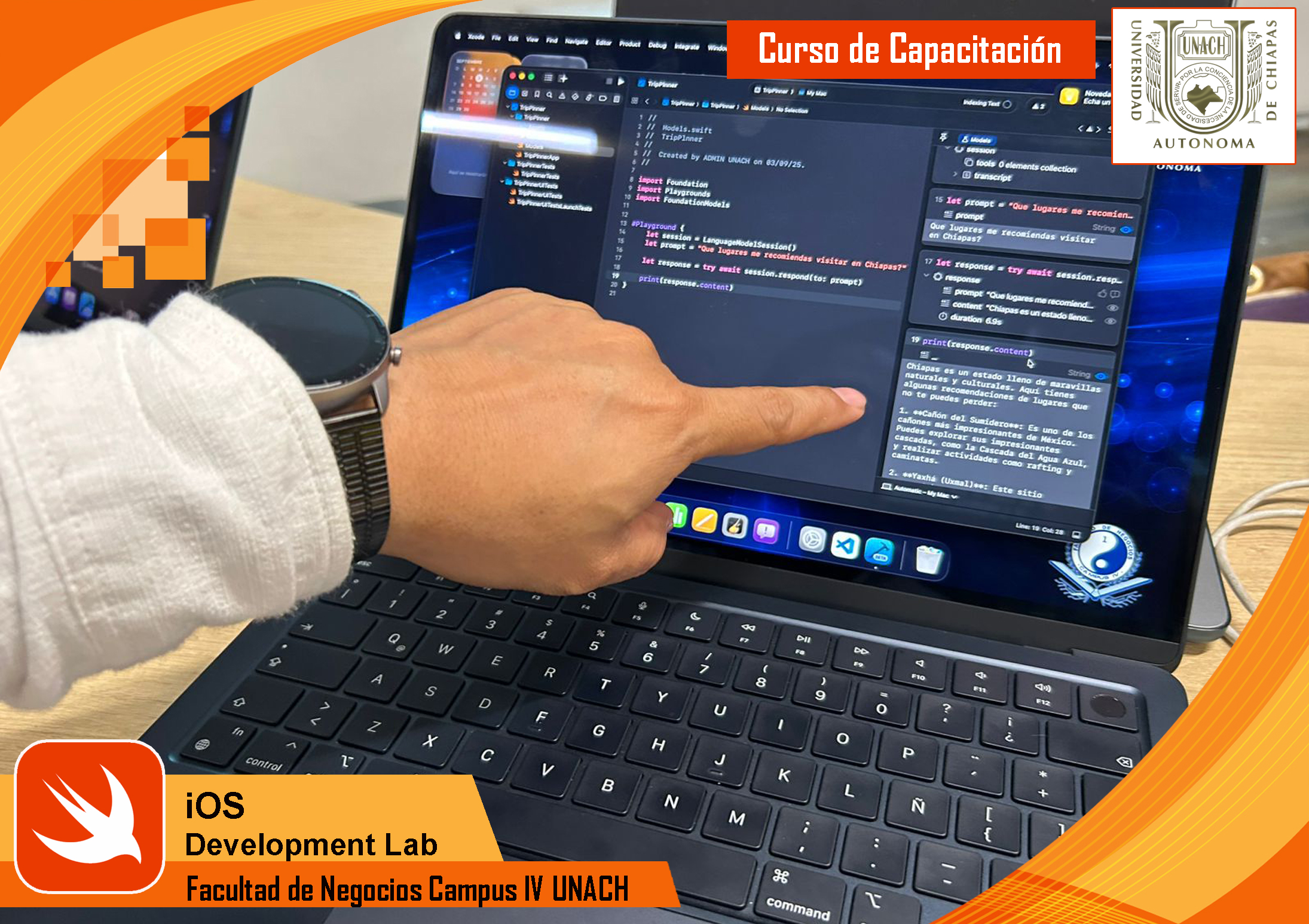 El Laboratorio de Desarrollo iOS de la Facultad de Negocios Campus IV de la Benemérita Universidad Autónoma de Chiapas, fue sede de curso-taller: Integración de Apple Intelligence en el desarrollo de aplicaciones iOS, con la valiosa asistencia de 12 Profesores de la Academia de Ingeniería de Software y tratamiento de información y 18 Personas estudiantes del programa educativo de LIDTS; quienes manifestaron un gran interés por aprender modelos de lenguaje fundamentales (LLMs), este nuevo framework está diseñado para facilitar la implementación de funciones de IA generativa en aplicaciones para ser desplegadas en dispositivos iOS; eliminando las barreras técnicas que hasta ahora dificultaban la integración de estas tecnologías. La inauguración de este evento fue realizada por el Dr. Gilibaldo Hernández Cruz, Director de la Facultad de Negocios, Mtra. Elba Mónica Solorzano Ruiz, Secretaria Academia de la Facultad, Mtro. Rene Servando Rivera, Coordinador de la LIDTS y Dr. Christian Mauricio Castillo Estrada, iOS Development Lab Manager; con el valioso apoyo de la Fundación Enactus México.